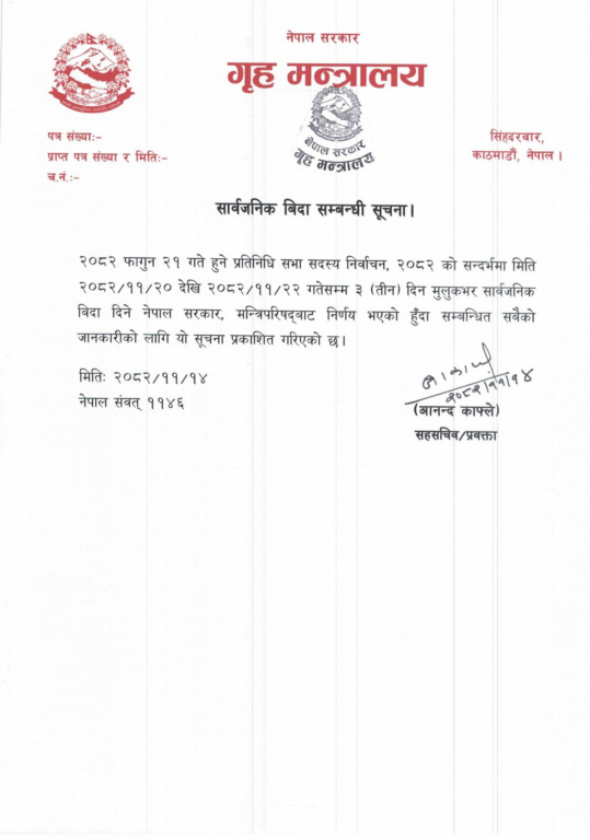 Voting for the House of Representatives election will take place on Falgun 21. With this, there will effectively be a week‑long holiday during the election period. This year, Holi falls on Falgun 18 in the hills and Falgun 19 in the Terai. On the 23rd (Saturday) and 24th (Sunday), International Women’s Day will also be observed.
