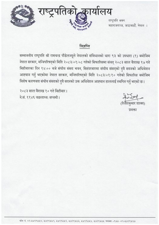 President Ram Chandra Paudel has postponed the Federal Parliament session previously scheduled for Baishakh 17.